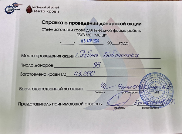 6 апреля в Дубне прошел очередной день донора, организованный Московским областным центром крови и Московским областным реготделением Союза машиностроителей России в рамках программы «Корпоративный донор Подмосковья».