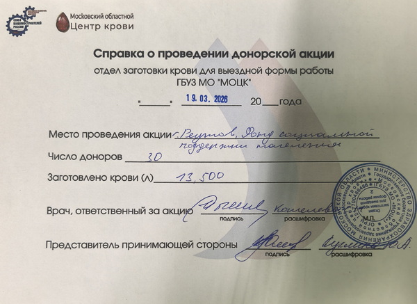 19 марта Московский областной центр крови и Московское областное региональное отделение Союза машиностроителей России провели День донора в г. о. Реутов в рамках программы «Корпоративный донор Подмосковья». В нем приняли участие сотрудники АО «ВПК «НПО машиностроения» и неравнодушные жители наукограда.